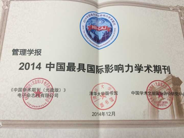 (通讯员 杨妍)12月16日,“2014中国最具国际影响力学术期刊暨中国学术期刊国际、国内引证报告发布会”在清华大学举行。《管理学报》被授予“2014中国最具国际影响力学术期刊”。