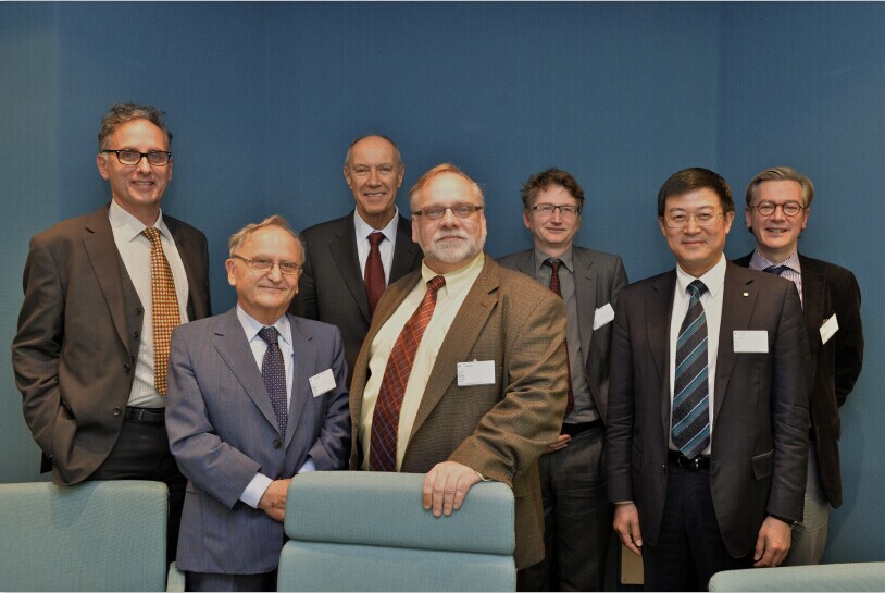 从右至左:英国牛津大学知识产权研究中心主任Graeme Dinwoodie教授、我院中德知识产权研究所所长余翔教授、英国剑桥大学知识产权与信息法中心主任Lionel Bently教授、美国加州大学欧文分校法学院Dan Burk教授、世界知识产权组织(WIPO)总干事Francis Gurry博士、国际贸易与可持续发展中心(ICTSD)高级顾问Pedro Roffe博士、世界贸易组织(WTO)知识产权部部长Antony Taubman博士